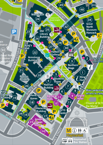 The university maintains a page with travel information on how to get to Newcastle University by train, car, and plane at https://www.ncl.ac.uk/who-we-are/contact/maps/. A general campus map is also available there. The main venue for the conference is the Armstrong Building, number 22 on the campus map. Here is an aerial view: