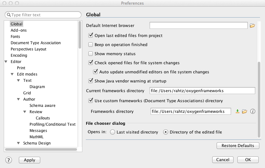 Start up oXygen, and go to Preferences/Global and scroll down on the right to ‘Use custom frameworks’, and put in your frameworks directory.