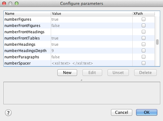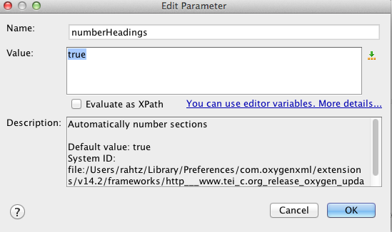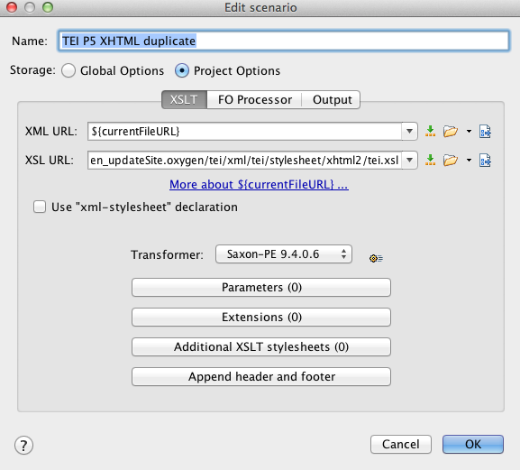 You can also change any of the parameters from within the oXygen editor. Do this by going to the stylesheet configuration. Untick (eg) TEI P5 XHTML, but keep it highlighted and select ‘Duplicate’. You should see something like this:
