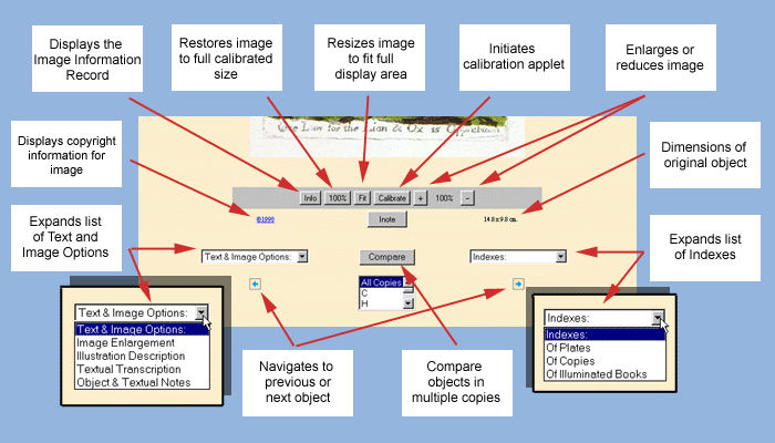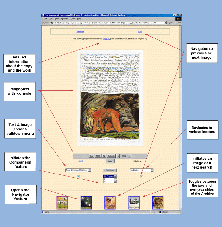 - Inspecting by isolation and enlargement (with precedents in all manner of enlarged visual details—such as electron micrographs, maps that isolate particular aspects of a landscape—and verbal description of such details, close reading, selective quotation). Examples in the Archive include our high-resolution enlargements of every image; elaborate verbal descriptions of every version of every illuminated-book image; Inote, an image viewer/annotator that ties visual details to verbal descriptions; and Imagesizer, which allows users to control the scale of images. All these, individually or in tandem, help users answer the fundamental question, what is that?