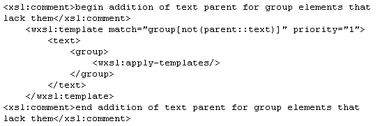 With the TEI-A schema in place, an XSLT "meta-stylesheet'' (MonkMetaStylesheet.xsl) consults the schema to determine the form into which the source files may be converted. This initial XSLT stylesheet is a meta-stylesheet in the sense that it programmatically authors another XSLT stylesheet. The first stylesheet, at roughly 500 lines of XSLT, is fairly short. The second is very long, around 7,000 lines. This second stylesheet (XMLtoMonkXML.xsl) contains the conversion instructions to get from P4, or other markup, to the TEI-A custom P5 implementation.