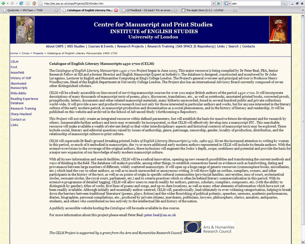 A freely accessible on-line record of surviving manuscript sources for over 200 major British authors of the period 1450-1700. It will incorporate descriptions of many thousands of manuscript texts of poems, plays, discourses, translations, etc., as well as notebooks, annotated printed books, corrected proofs, promptbooks, letters, documents and other related manuscript materials, many hitherto unrecorded, found in several hundred public and private collections world-wide. It will provide a new and productive research tool not only for those interested in particular authors and works, but for anyone interested in the literary culture of the early modern period, in manuscript production and dissemination as a social phenomenon, and in the history of literacy and readership.