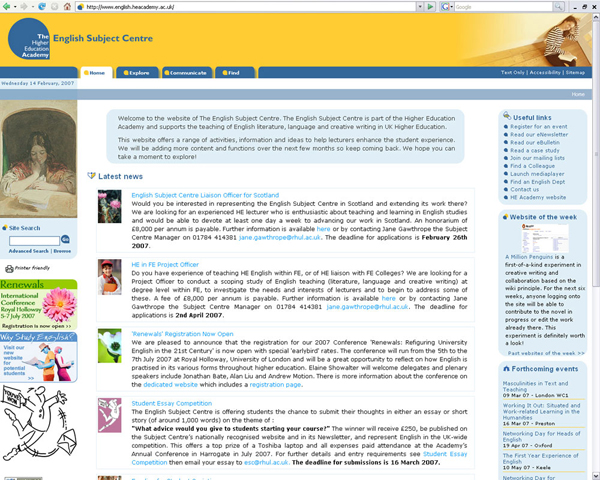 The English Subject Centre is part of the Higher Education Academy and supports the teaching of English literature, language and creative writing in UK Higher Education. This website offers a range of activities, information and ideas to help lecturers enhance the student experience.