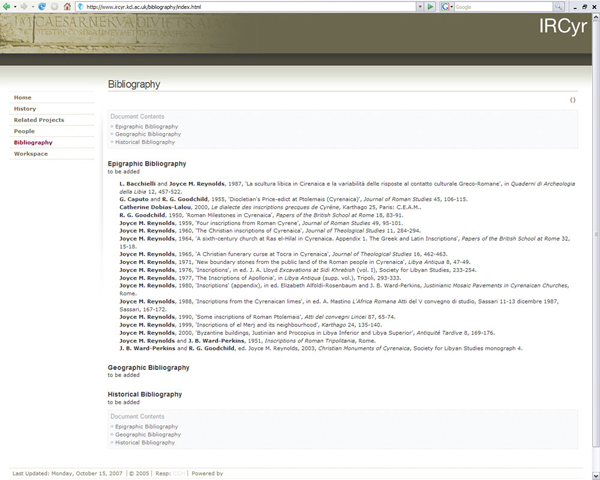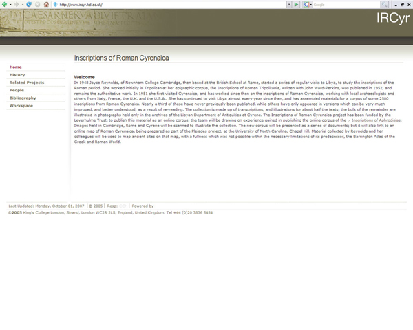 The project aims to assemble an online corpus of all the material gathered by Prof Joyce Reynolds during her numerous visits to Libya. The project consists in the digitisation of some 2000 inscriptions from Roman Cyrenaica, nearly a third of which have never previously been published. The new corpus will be presented as a series of documents; but it will also link to an online map of Roman Cyrenaica, being prepared as part of the Pleiades project (http://www.unc.edu/awmc/pleiades.html).