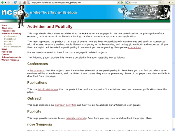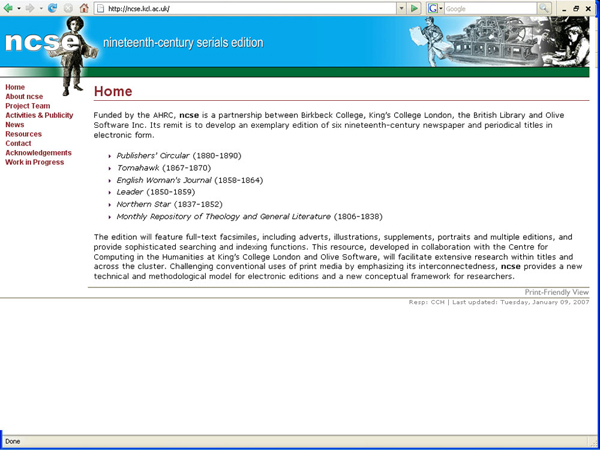 NCSE is a research project in nineteenth-century serials which is creating an electronic edition of a cluster of six titles. In addition to full text and other searches, the edition will include historical and critical apparatus, allowing extensive research within and across titles in the cluster. The edition will feature full-text facsimiles, including adverts, illustrations, supplements, portraits and multiple editions, and provide sophisticated searching and indexing functions.