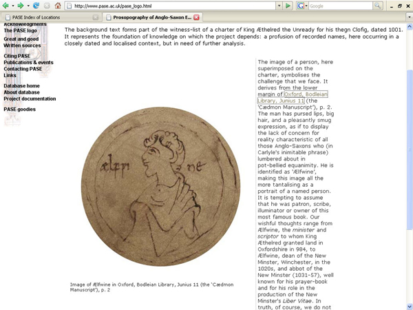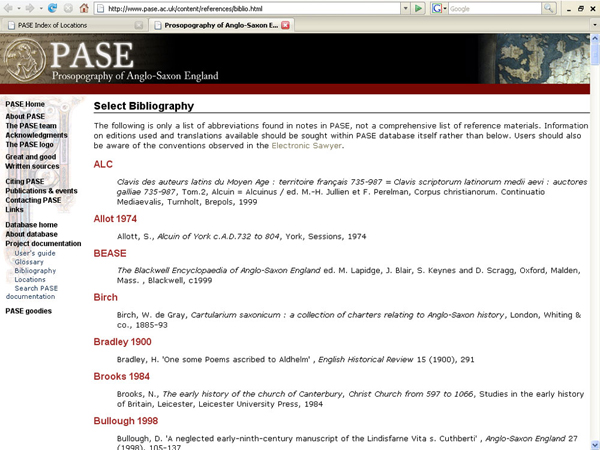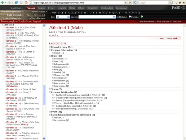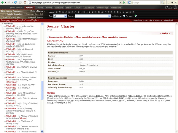 The Prosopography of Anglo-Saxon England (PASE) was funded for five years (2000-4) by the AHRB (now the AHRC). The online publication is built round a relational database comprising a structured register of persons that includes, in principle, every recorded individual who lived in, or was closely connected with, Anglo-Saxon England from 597 to 1066.